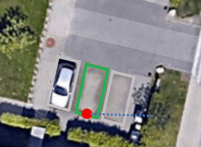 Punkthus-løsningen indebærer at der opstilles en lade-stolpe (rød prik) ved den midterste parkeringsplads